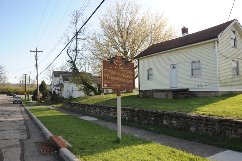 The house burned down in 1858, and the riverbank was reengineered, with highways, railways, and house lots. Nothing remains to mark the site except a plaque that celebrates it as the birthplace of Benjamin Harrison.